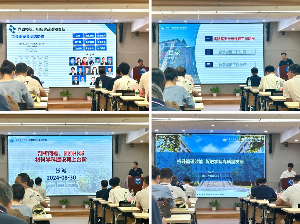 工会工作,工会认真履行职责,担负思想政治引领责任,继续开展“与书有约”等活动,落实“五慰问”制度,丰富体育活动,增强教工交流, “先进基层工会”等工会集体和个人荣誉。院长助理刘鑫旺从工作职责、春季学期工作进展和秋季学期工作重点三个方面汇报实验室安全与保障工作。院长助理张诚汇报材料学科建设工作的成绩、问题与工作计划。院长助理赵帅从充分发挥委员会功能、强化A漫