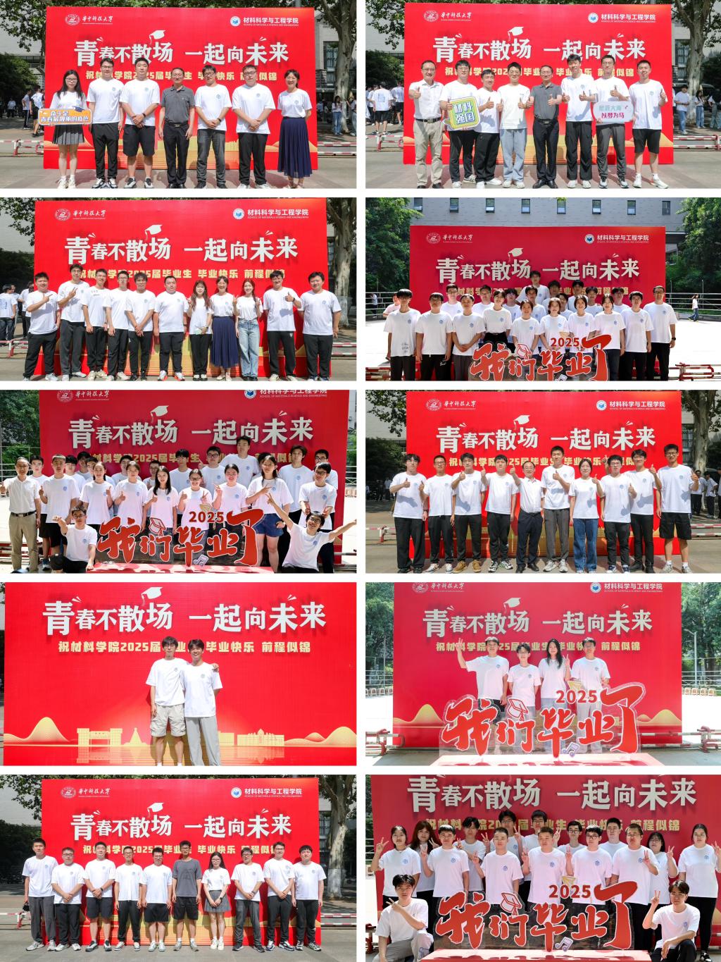阳光透过枝桠洒下金色光斑,大合影结束后,毕业生们自发在背景墙前合影留念,灿烂的笑脸展现着材料学子的青春风采。