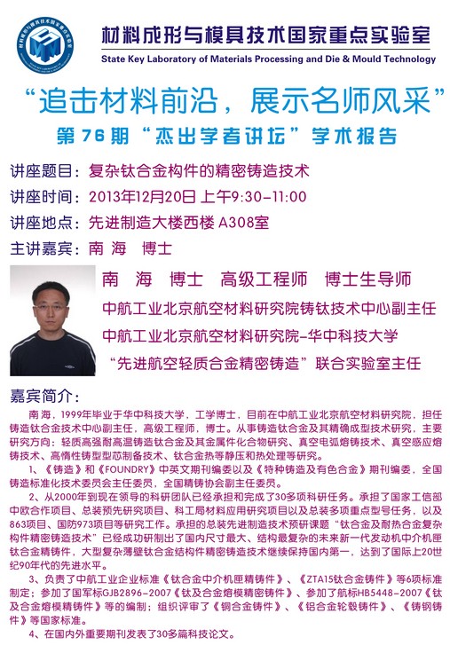 中航工业北京航空材料研究院铸钛技术中心副主任南海博士来我院做报告,南海博士是中航工业北京航空材料研究院-A漫 “先进航空轻质合金精密铸造”联合实验室主任。
