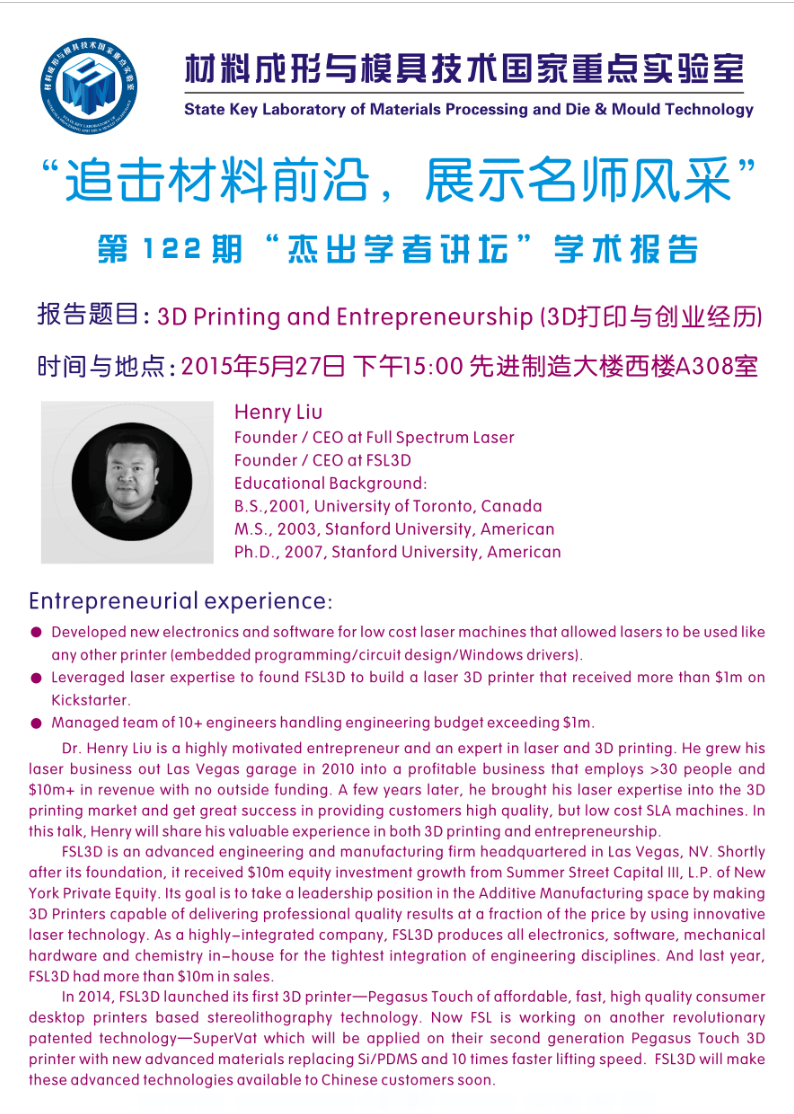 【5月27日】HenryLiu:3D打印与创业经历