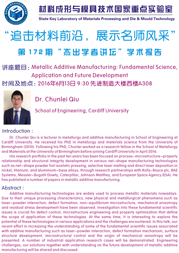 【6月13日】第172期“杰出学者讲坛”学术报告 Dr. Chunlei Qiu