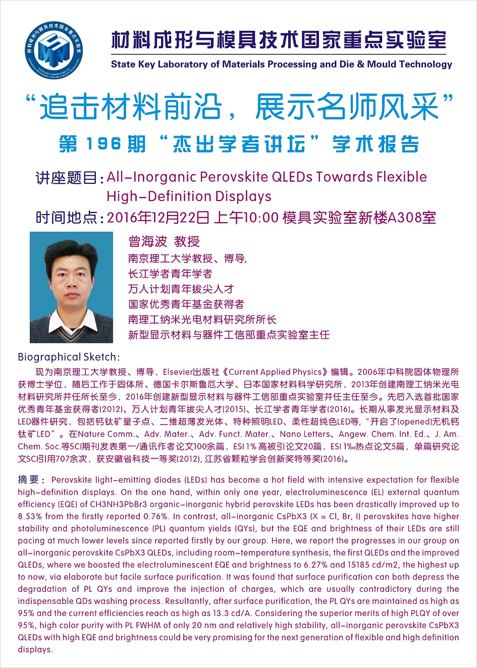 【2016年12月22日】第196期“杰出学者讲坛”学术报告