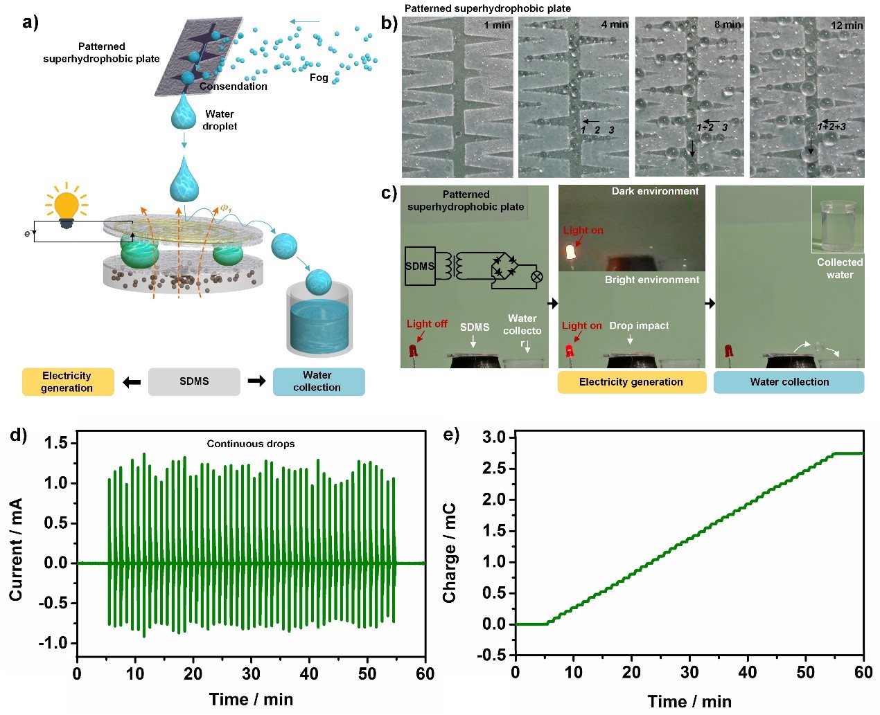 为第一完成单位。上述论文设计新型的柔性磁电复合材料体系,将超疏水表面引入到课题组2019年开发的柔性磁电材料体系中,提出了一种全新的收集环境离散水能的研究模型,同时实现了净水收集和电能转换。该研究为环境集水发电一体化的研究提供了新的思路和方法(见图1)。