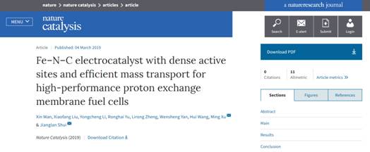 3月,国际知名期刊《Nature Catalysis》以“具备高密度活性位点和高效传质的铁-氮-碳电催化剂用于高性能质子交换膜燃料电池”为题,刊发了A漫A漫