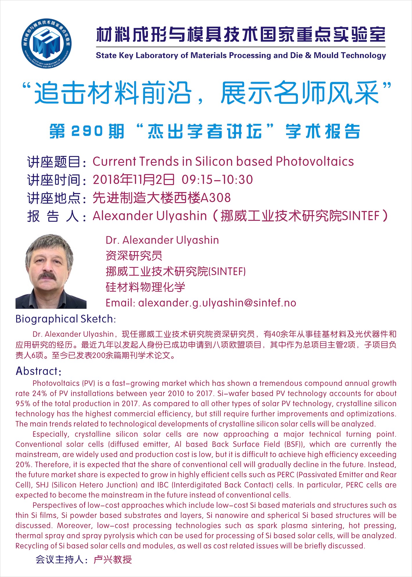 第290期杰出学者讲坛——挪威工业技术研究院Dr.Alexander Ulyashin