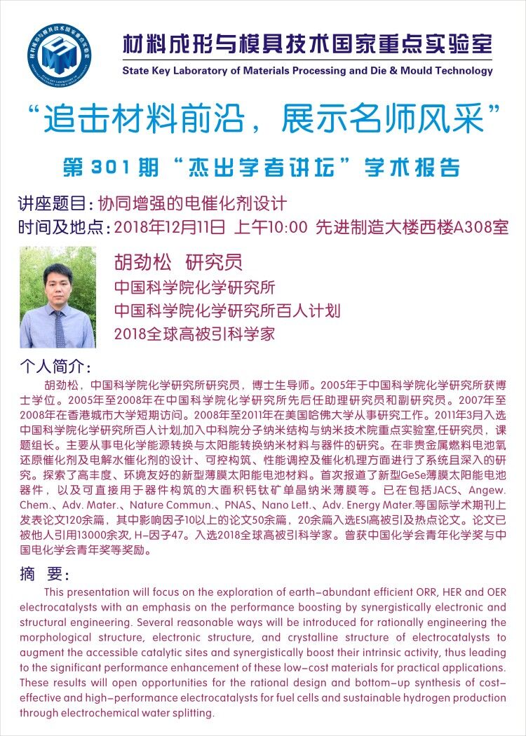 第301期杰出学者讲坛——中科院化学所胡劲松研究员