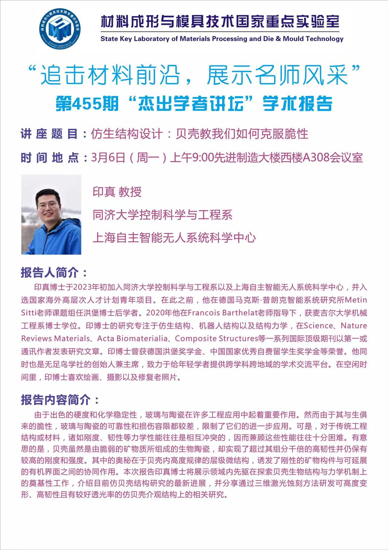 2023年3月6日“杰出学者讲坛”:仿生结构设计:贝壳教我们如何克服脆性