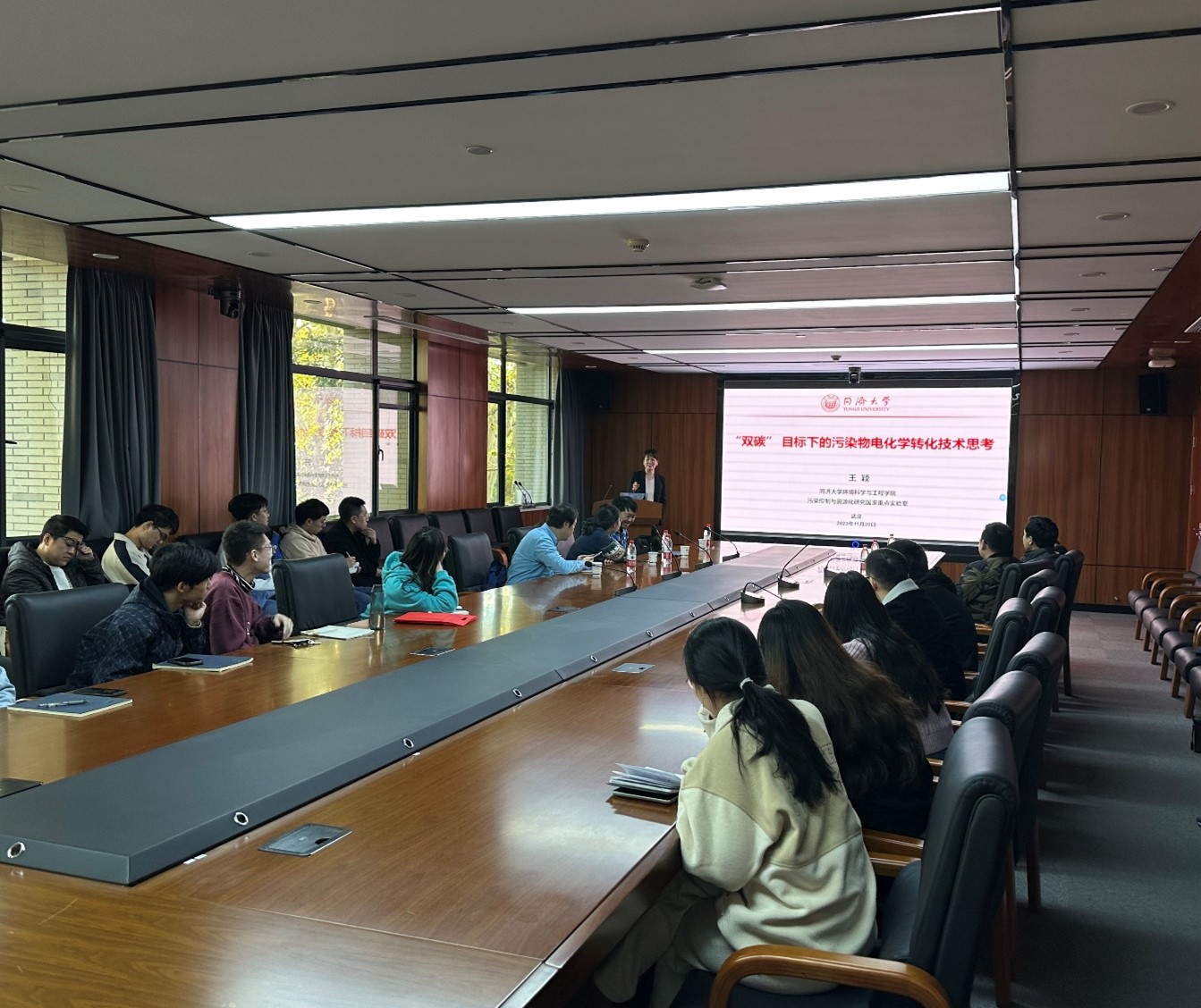 王颖教授课题组致力于面向“双碳”目标的可持续电化学资源再生领域的基础研究与技术开发应用。包括界面电化学与纳米催化、污染物电分析、先进环境功能材料设计与制备、电化学水处理新技术、环境污染修复研究等。在报告中王颖教授首先介绍了在“双碳”目标下的环境治理技术面临的挑战;提出通过电化学助力技术降低环境治理过程中药剂的添加,实现减污降碳协同增效;随后深入的讲解了课题组近几年在电化学污染物转化技术中的研究成果,借助原位电化学质谱检测电化学反应中间体解析反应机理;最后总结了该技术的研究前景。报告内容丰富,并且诙谐幽默,让人受益匪浅,在场师生对污染物电化学转化技术领域和通过质谱研究反应机理有了更加深刻的理解。