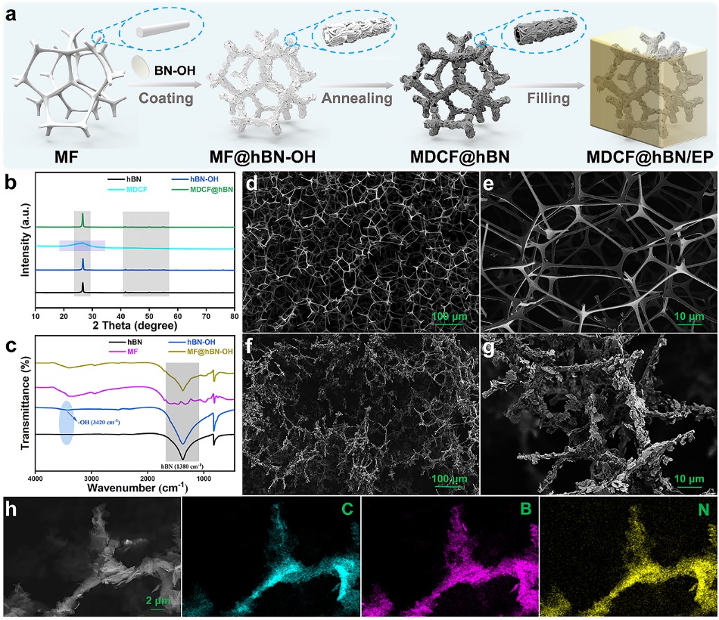 最近,半导体材料与器件研究中心的杨君友教授课题组通过静电自组装将表面带有负电荷的羟基改性的hBN包裹在3D三聚氰胺衍生碳泡沫(MDCF)的表面,然后利用真空浸渍法将获得的MDCF@hBN浸入EP中以成功的开发出一种新型的电子封装材料(MDCF@hBN/EP)。其中,MDCF@hBN独特的结构优势以及MDCF与hBN的协同效应优化了复合材料的阻抗匹配,增强了介电损耗和极化损耗能力。因此,MDCF@hBN/EP表现出-52.77 dB的高电磁波吸收能力,以及 5.6 GHz的有效吸收带宽。同时,3D MDCF@hBN 增强了EP的热传输路径,促使MDCF@hBN/EP 在室温下的热导率达到了0.99 Wm-1 K-1,是纯 EP 的 5.5 倍。增强的散热性能与优异的电磁波吸收性能相结合,表明MDCF@hBN/EP是一种很有前途的大功率集成电路电子封装材料(图 1b)。