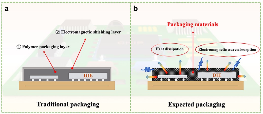 近90%的集成电路电子封装材料采用高分子聚合物(尤其是环氧树脂),因为它们具有优异的机械性能、电绝缘性和易加工性。随着轻量化、集成化和高功率密度集成电路的快速发展,热量积累和电磁干扰问题日益严重。不幸的是,环氧树脂(EP)本身具有极低的热导率(例如,在300 K时约为0.2 Wm-1 K-1),并且也不能有效的阻碍电磁波的穿透(即没有电磁波吸收能力)。随之而来的热量聚集和强电磁干扰问题严重降低了集成电路的稳定性和可靠性。因此,通过引入高导热填料(如碳材料、纳米陶瓷、金属颗粒等)提高环氧树脂的热导率以实现高效的热量传输;此外,在环氧树脂表面构建金属屏蔽层,增强电磁波的反射损耗以实现低电磁干扰,图 1a。然而,这不仅增加了制造工艺复杂性,还增大了集成电路的体积。