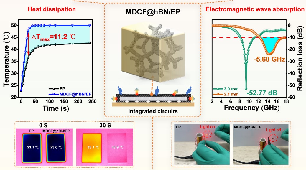 论文原文:High performance epoxy resin with efficient electromagnetic wave absorption and heat dissipation properties for electron packaging by modification of 3D MDCF@hBN