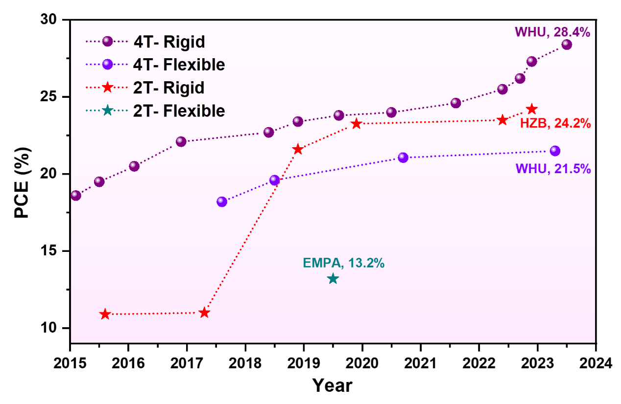 图2.刚性/柔性钙钛矿/CIGS叠层电池效率发展折线图