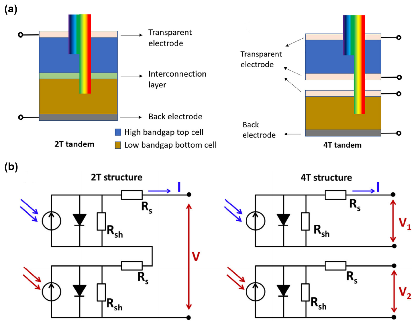 图3.2-T/4-T叠层电池构架、等效电路示意图