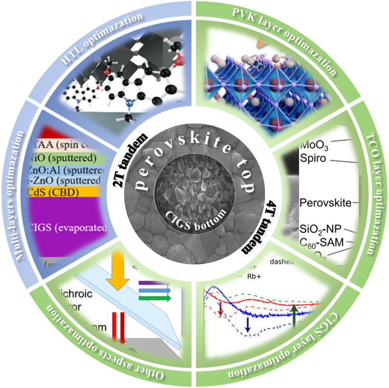 基于此,杨君友教授课题组对钙钛矿/CIGS 叠层太阳能电池的最新研究进展进行了全面的归纳,特别关注了器件结构的复杂设计和前沿的制备方法。重点阐述了界面工程、材料成分优化和加工参数的精确控制在提升器件光伏性能中的关键作用。