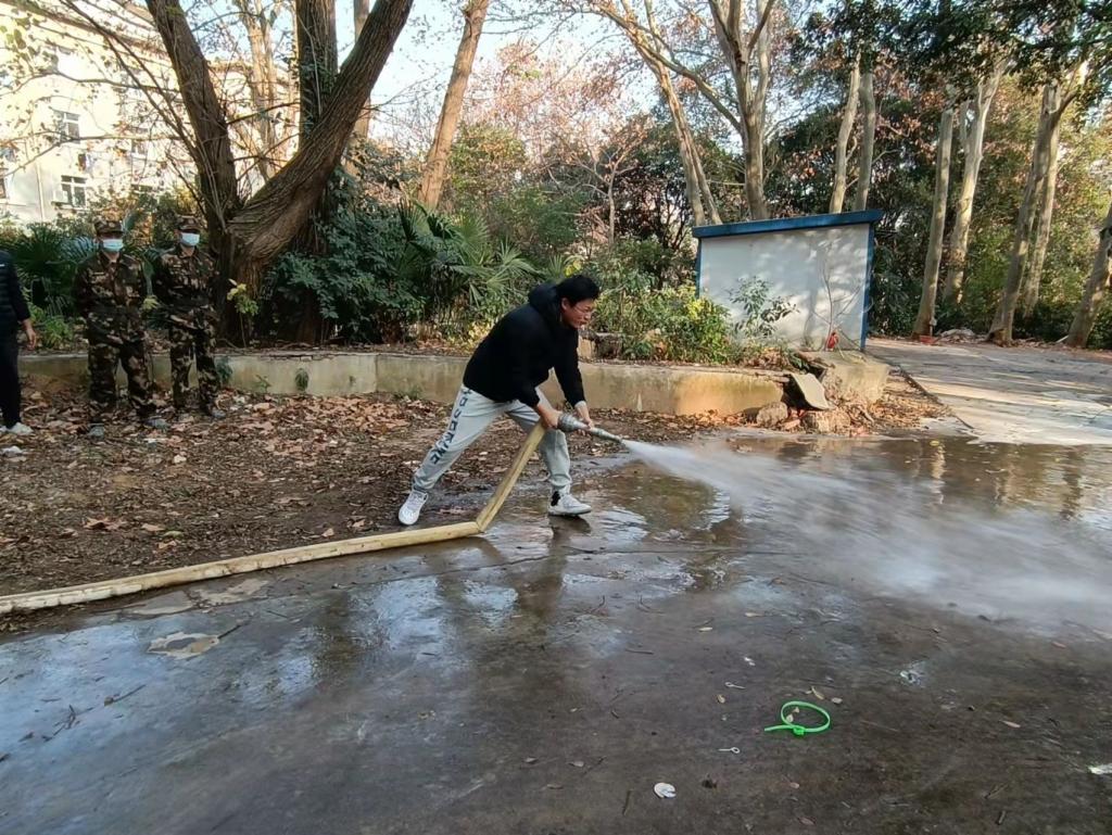 在前期踩点之后,郑明皞老师将培训的地点确定在防伪中心对面的清运场附近。2021年12月21日下午3点钟,消防员和消防车就位,郑明皞老师对参加培训活动的师生详细讲解了干粉灭火器、二氧化碳灭火器的使用条件以及使用方法,并亲自演示了水带管接头的接法。随后,同学们分成四组踊跃上前练习“一提(提起灭火器)、二拔(拔掉保险销)、三握(握住喷管最前端)、四对(对准火焰根部)、五喷(往下按压阀,对准火焰左右喷射)”。二氧化碳灭火器可以隔绝空气,一般在密闭空间使用,用来扑救贵重设备、档案资料、仪器仪表、600伏以下电气设备及油类引起的火灾,郑老师特别强调二氧化碳灭火器使用时一定要握住喇叭型喷筒的位置,以免发生冻伤。