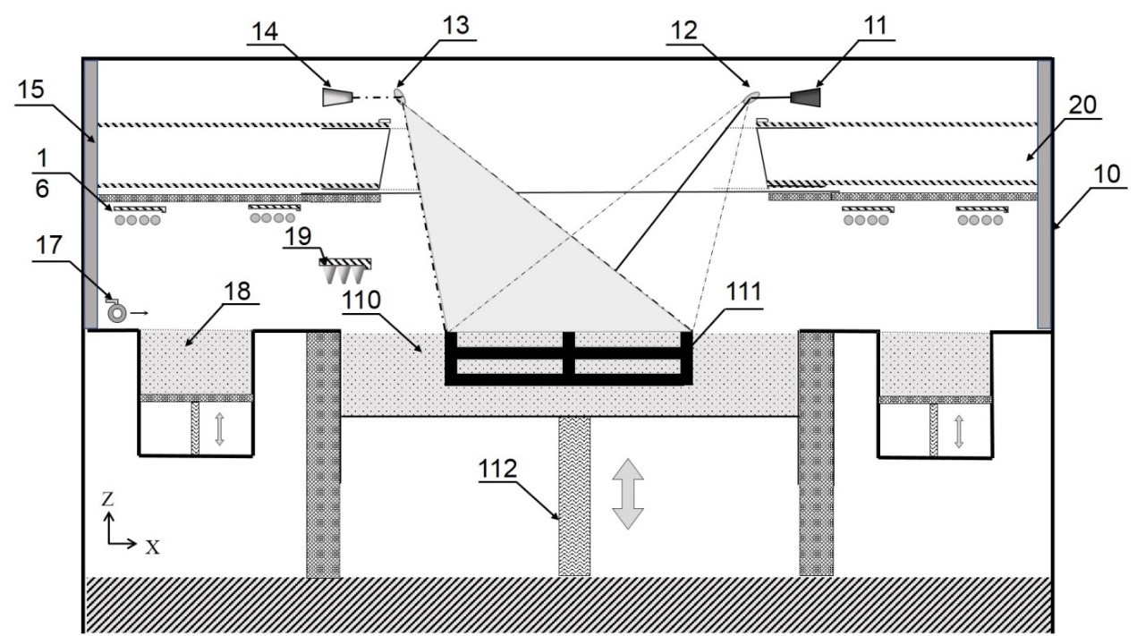 11-激光器,12-振镜,13-保温层,14-加热装置,15-铺粉刮板,16-铺粉缸,17-成形缸,18-成形缸缸壁,19-成形形坯,110-成形台面,111-成形缸缸壁升降装置,112-SLS设备升降装置,113-导轨轮,6-导轨,115-地面