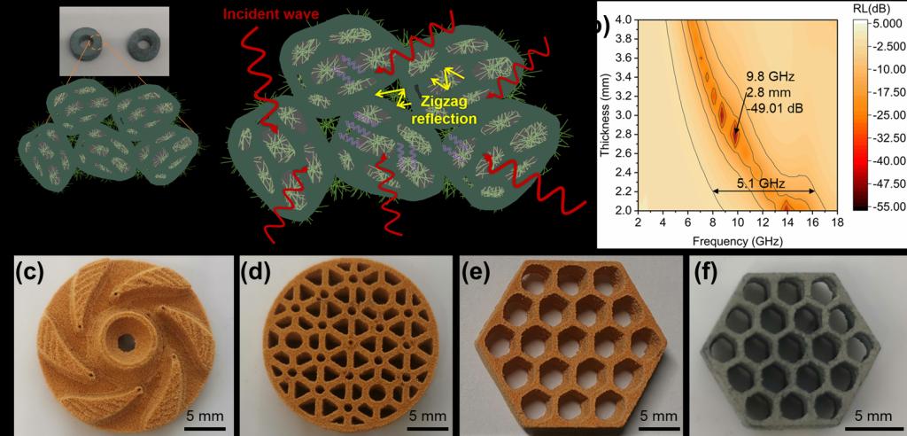 (a)吸波机理和(b)吸波效能;(c~e)生物质复杂构件坯体;(f)多孔碳化硅复合材料蜂窝结构吸波器