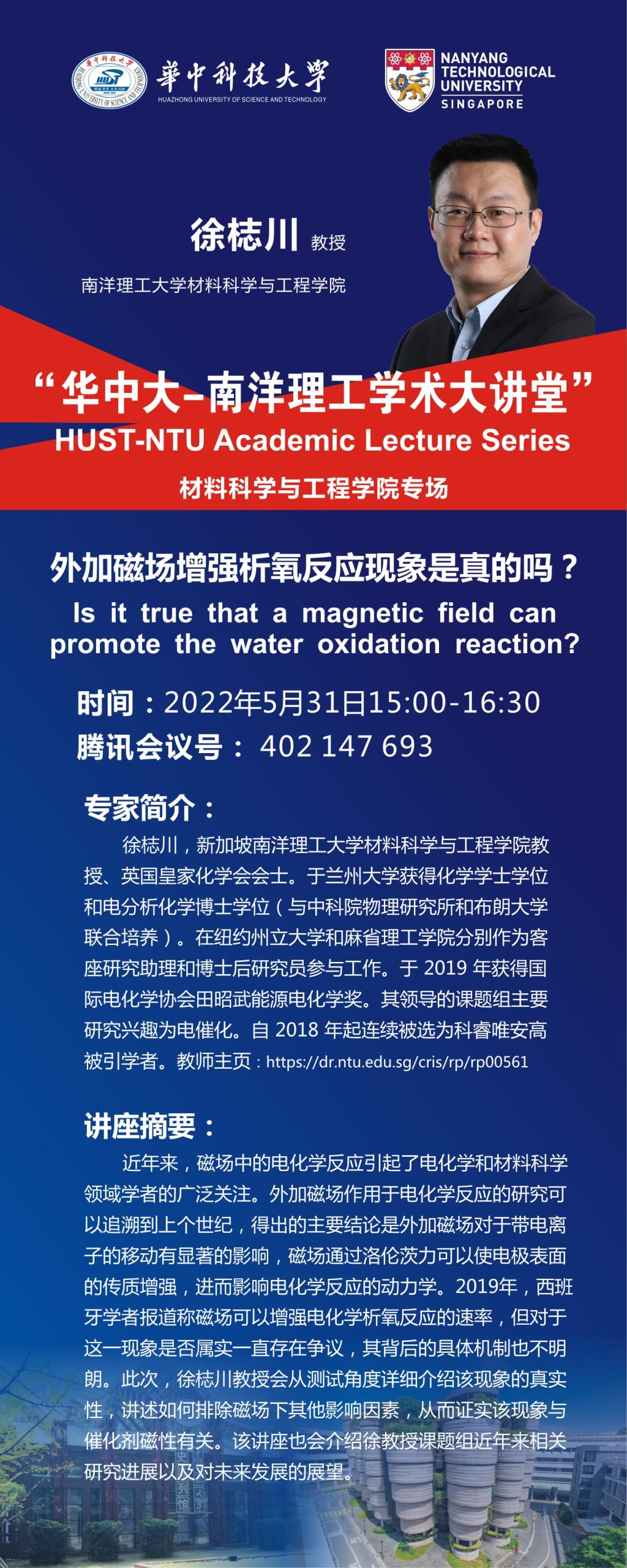 2022年5月31日“华中大-南洋理工学术大讲堂”:外加磁场增强析氧反应现象是真的吗?