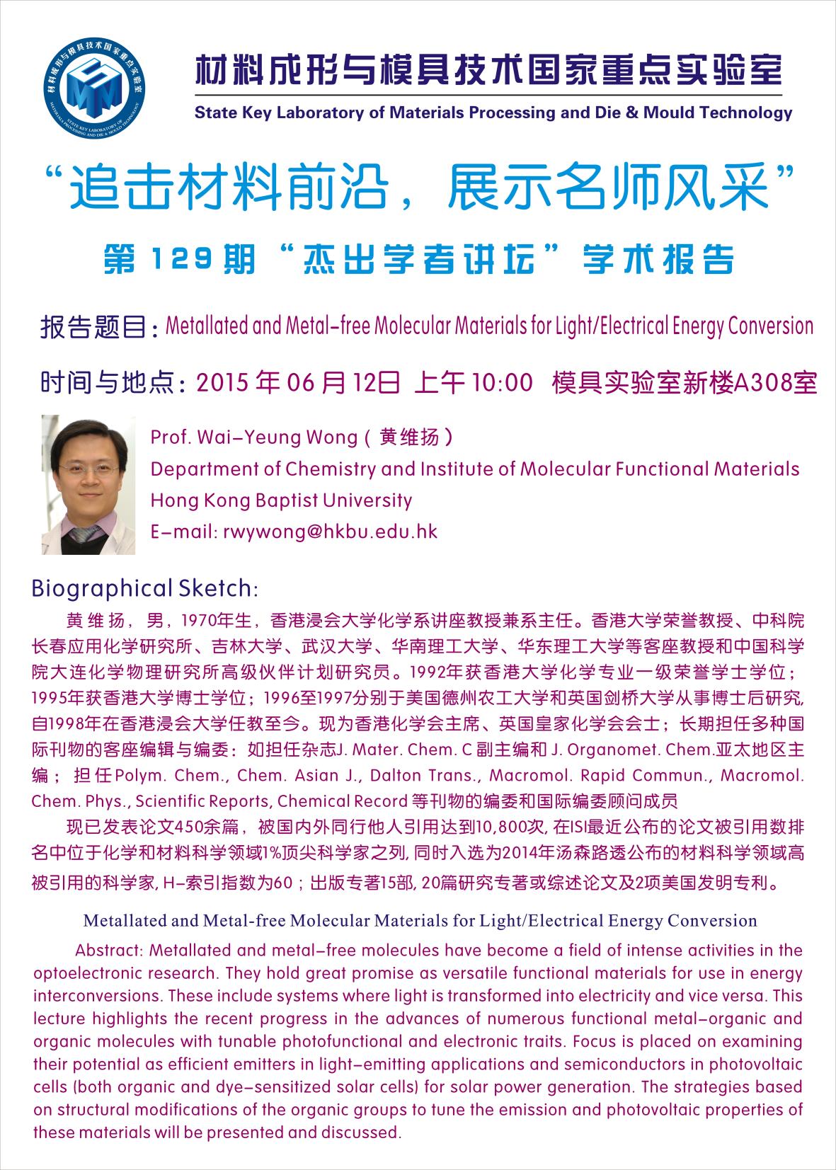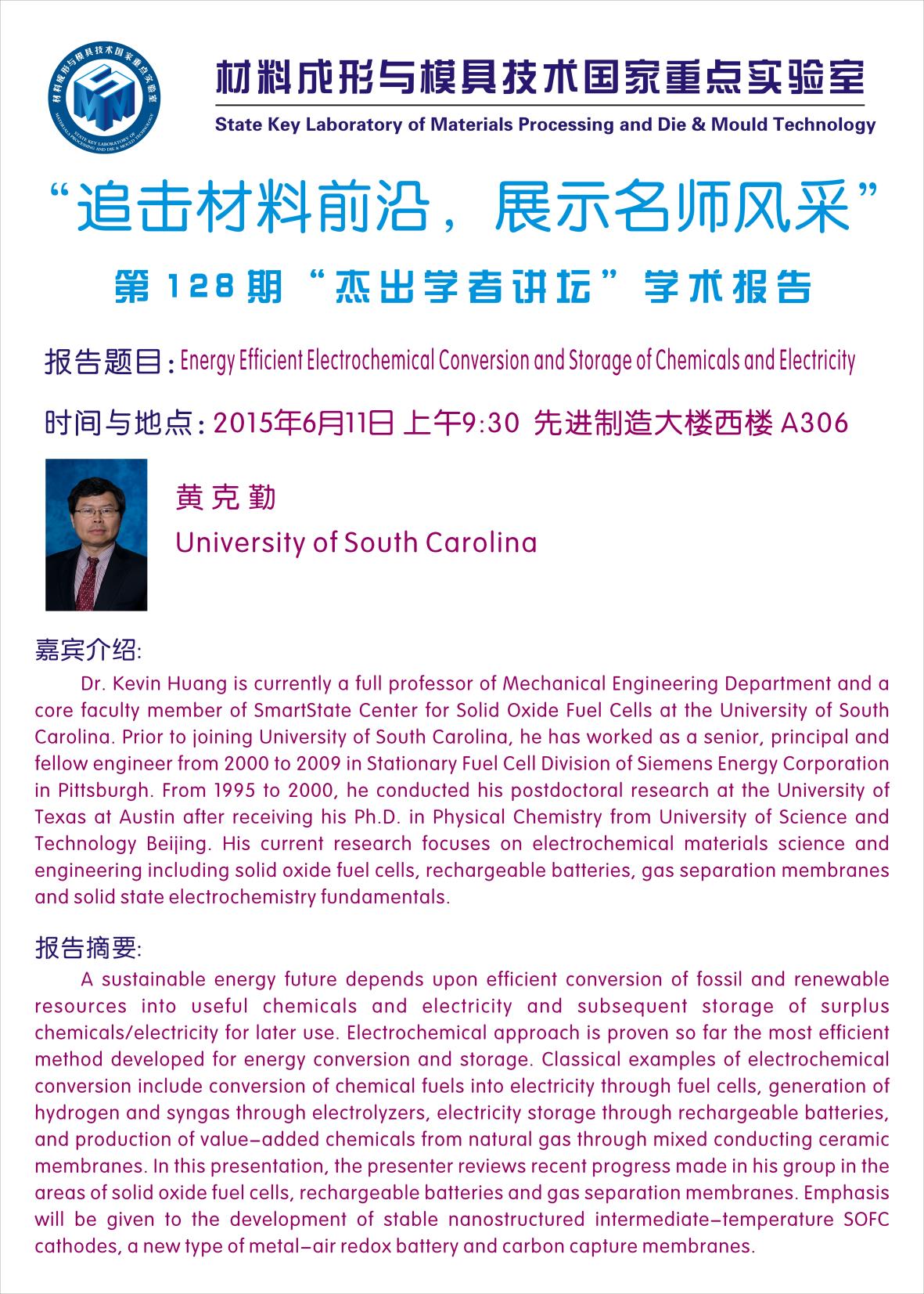 第124期“杰出学者讲坛”学术报告 讲座题目:水系锂(钠)离子电池:一种具有应用前景的储能电池 时间及地点:2015年6月5日 上午10:00 模具实验室新楼A308室 主讲人…