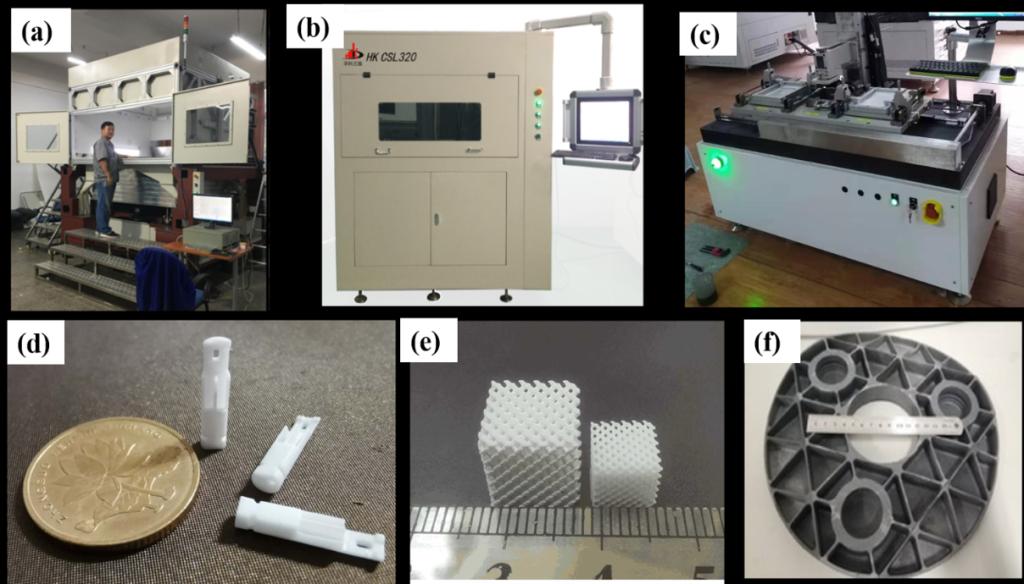 图5 研发的陶瓷增材制造装备及增材制造的典型陶瓷零件:(a) 全球最大台面陶瓷激光选区烧结装备(成形尺寸达1700 mm×1700 mm×600 mm);(b) 工业级陶瓷光固化装备;(c) 世界先进的多陶瓷材料光固化装备;(d) 氧化锆温压传感器用陶瓷定位衬套;(e) 可降解生物陶瓷支架;(f) 碳化硅陶瓷基复合材料反射镜镜坯