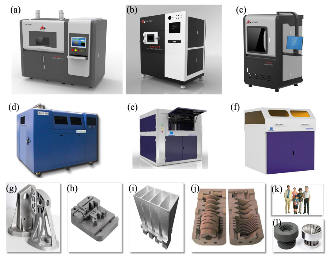 图4 研发的增材制造装备及增材制造的典型零件:(a) 激光选区烧结(SLS)装备;(b) 激光选区熔化(SLM)装备;(c) 光固化(SL)装备;(d) 微滴喷射砂型装备;(e) 微滴喷射金属装备;(f) 全彩石膏增材制造装备;(g) 机身轻量化拓扑结构件-发动机零部件飞机附件;(h) 注塑模具-轮胎模具;(i)雷达零部件通信部件生产设备零部件;(j) 铸造砂型芯;(k) 全彩3D石膏人像;(l) 铸造砂型芯-叶轮