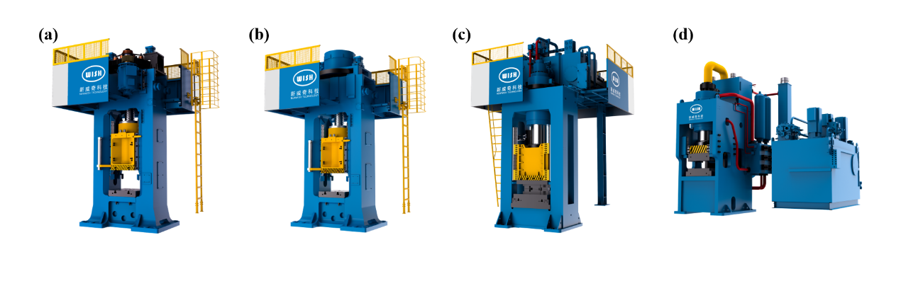 图6 研发的各类先进的模锻成形装备:(a) J58K系列数控电动螺旋压力装备;(b) J58ZK系列直驱式数控电动螺旋压力装备;(c) Y68SK系列数控模锻伺服液压装备;(d) Y68SKP系列伺服液压平锻装备