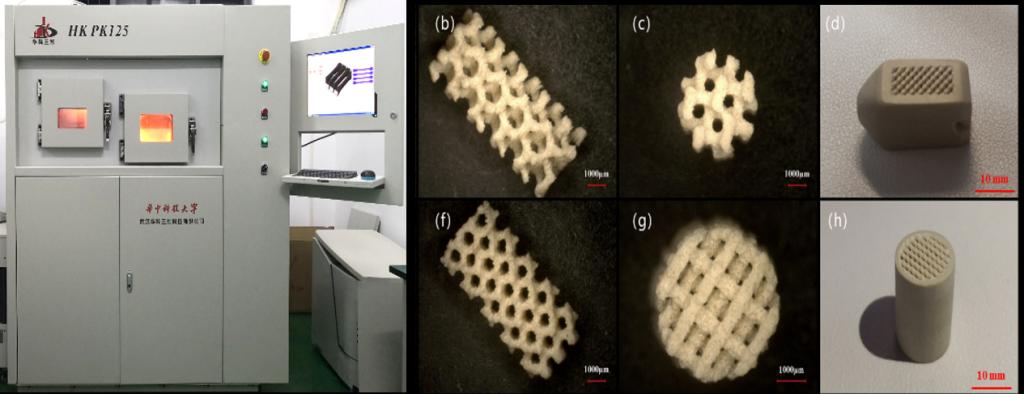 陶瓷生物材料增材制造技术与装备:实现了高精度点阵结构可降解生物陶瓷支架的制造,结合钙硅基材料设计和梯度结构设计实现了生物陶瓷支架的力学及生物性能的调控,成功制造了骨缺损修复多孔生物陶瓷支架,应用于临床骨缺损修复,解决自体移植和异体移植方面存在的形状不匹配、免疫排斥等问题。研发出工业级生物陶瓷光固化装备,其成形台面尺寸达320 mm×320 mm,精度能够达到0.05 mm。